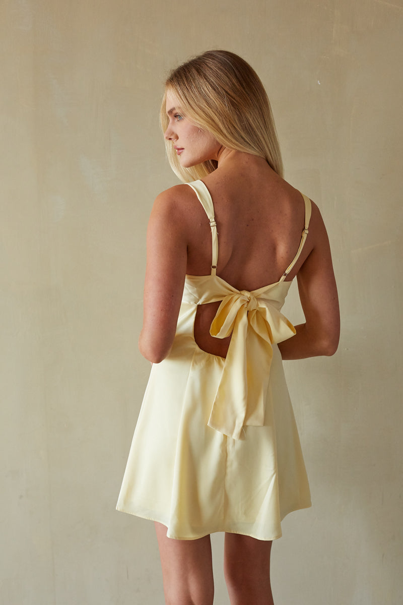 Get ready to flirt it up in the Lizzy Front Twist Tie Back Mini Dress, perfect for any occasion. This mini dress features a twisty front neckline, tie back, and adjustable straps. Pair this mini dress with gold accessories and your favorite platform heels or sandals.
